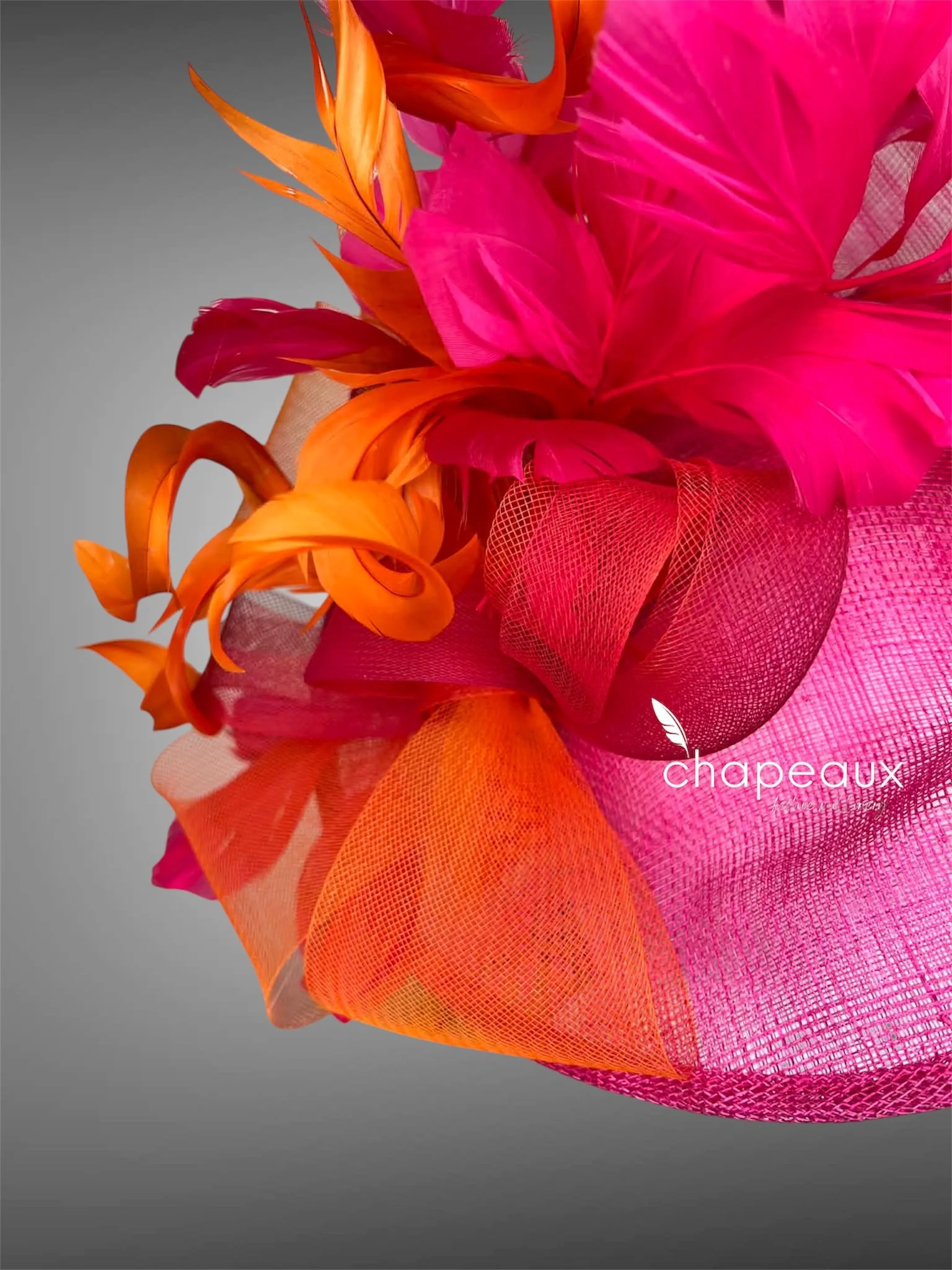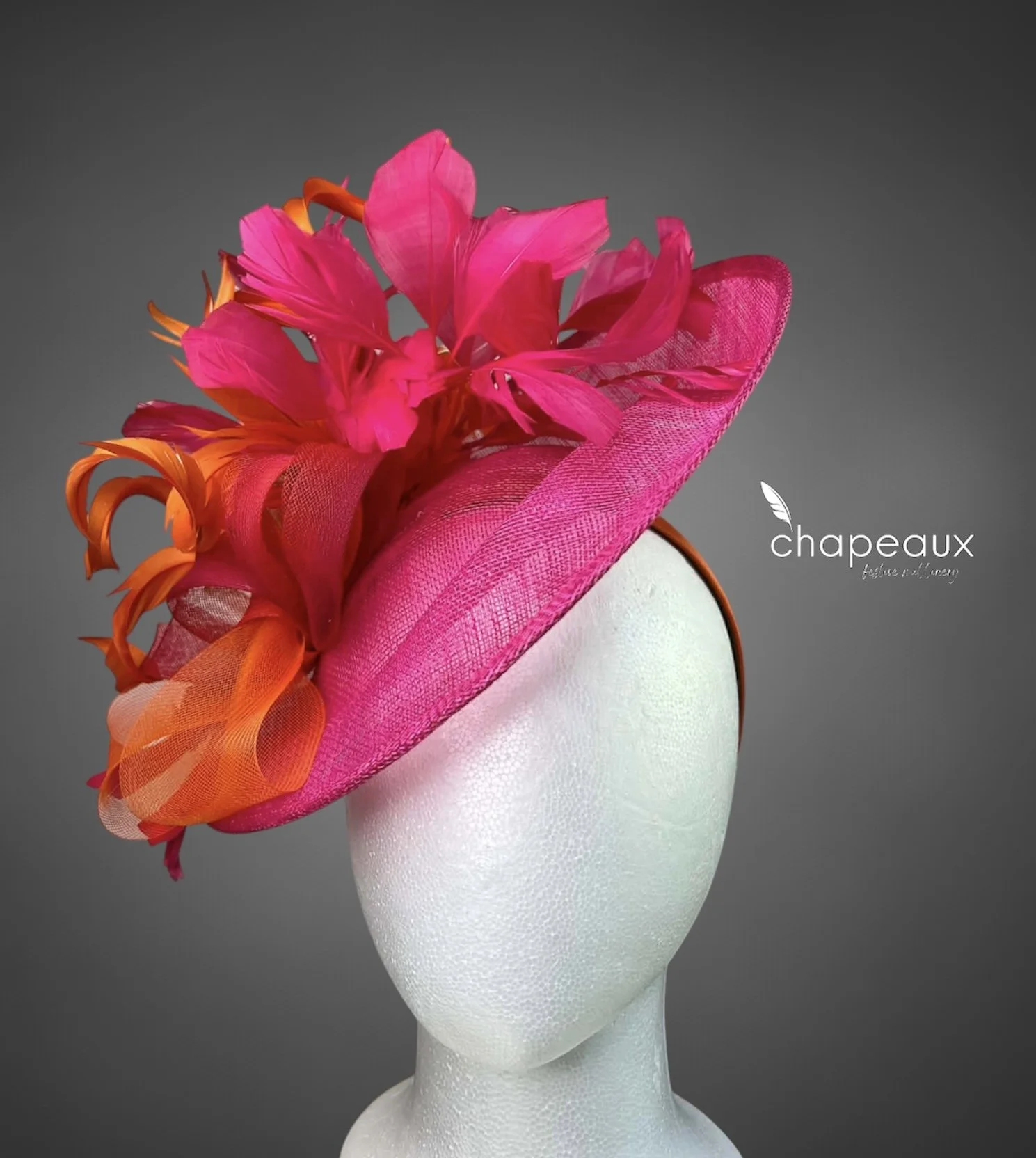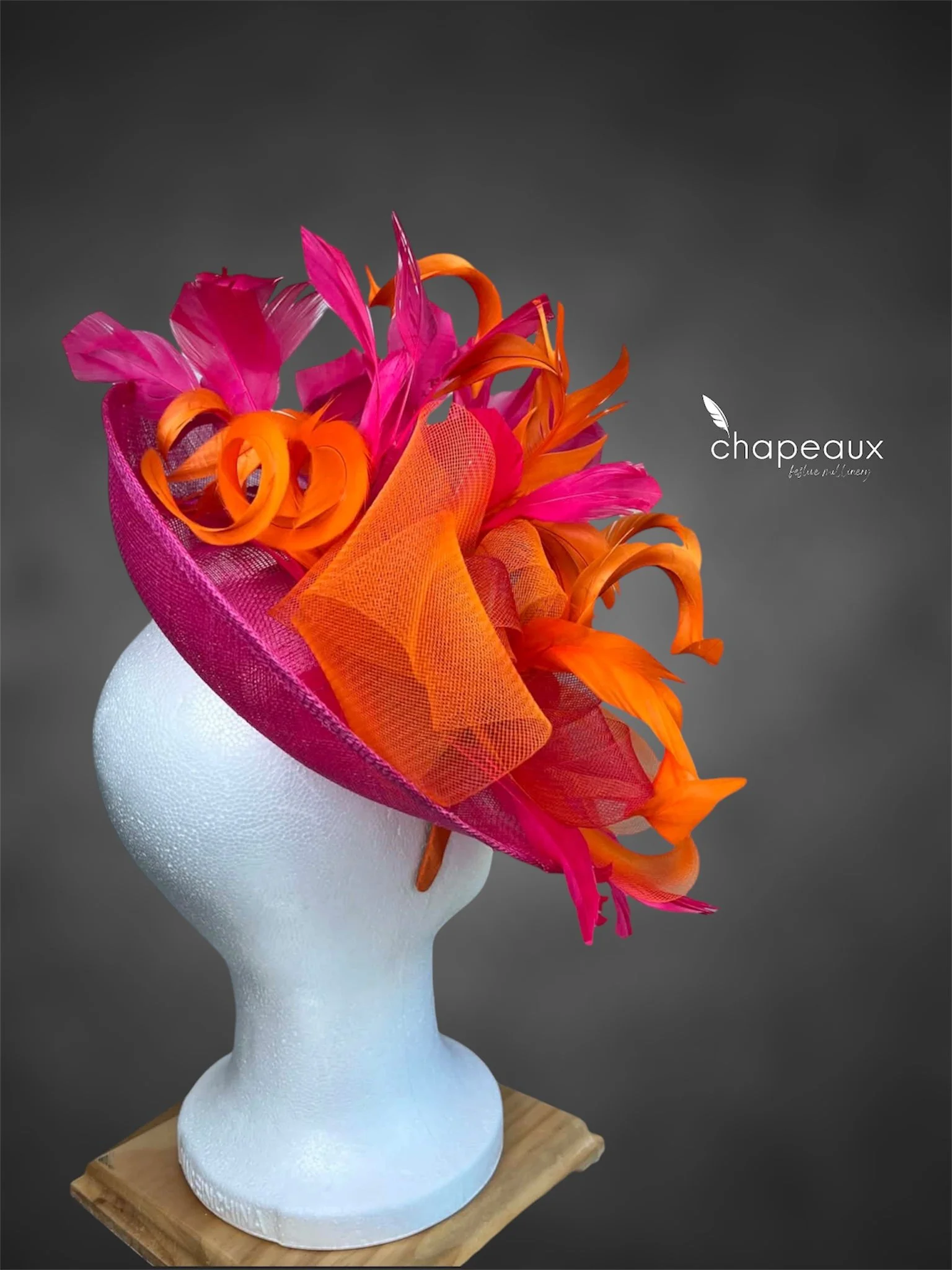 We can't get enough of this color combo - the beauty of a fiery sunset, brought to life in cut feathers and custom painted crinoline in ombré shades of orange and deep pink. On a round fuscia sinamay base. Attaches with a matching satin headband.