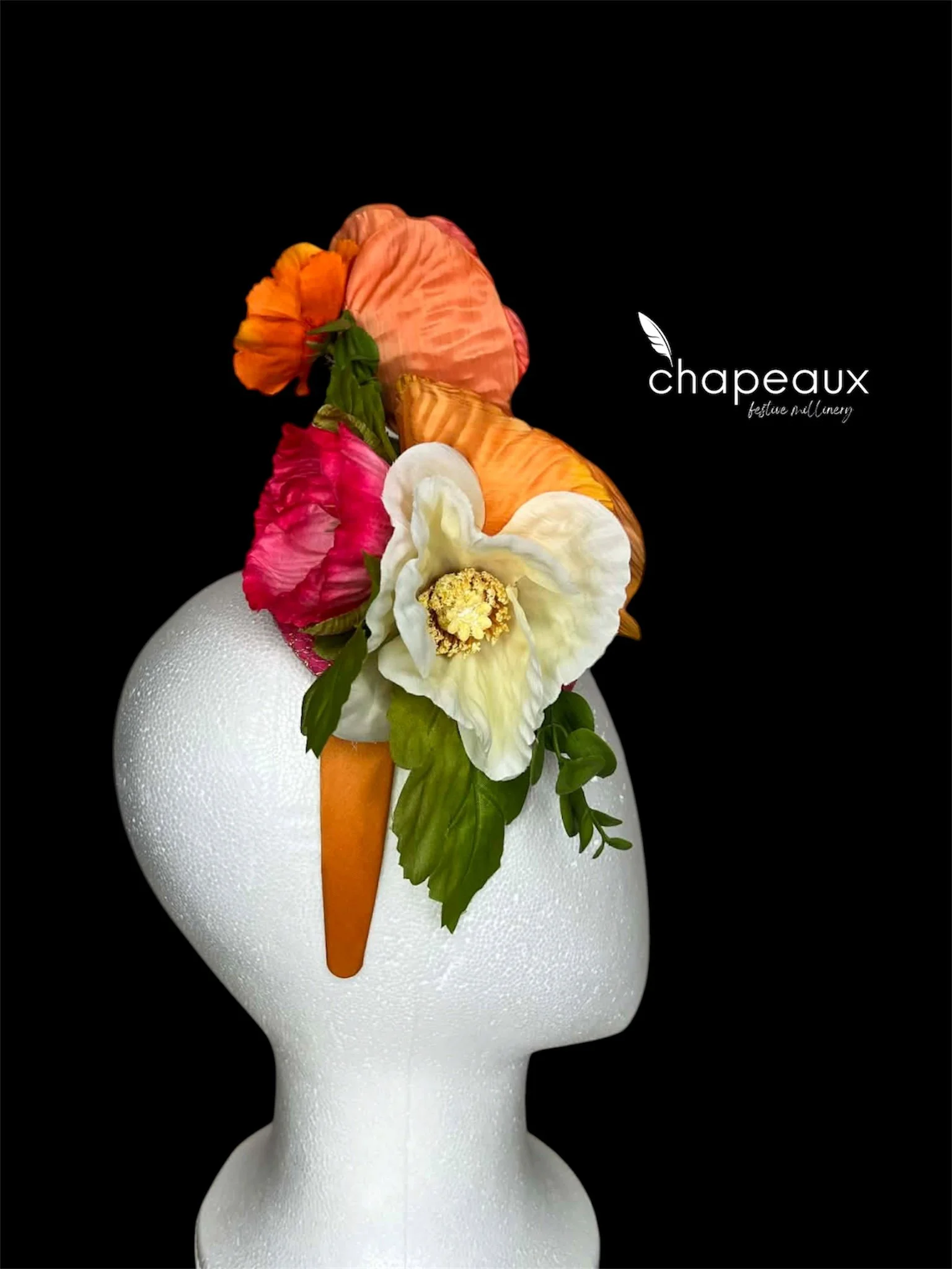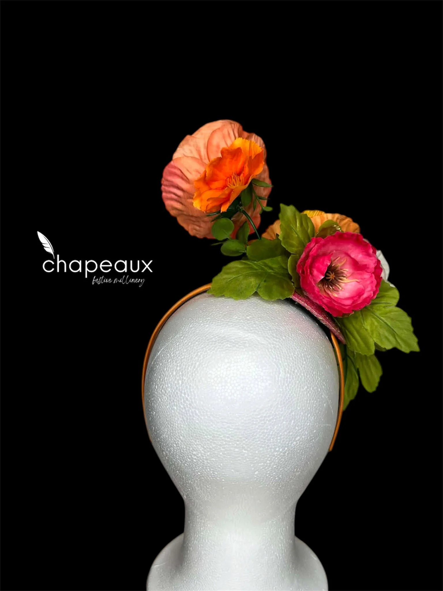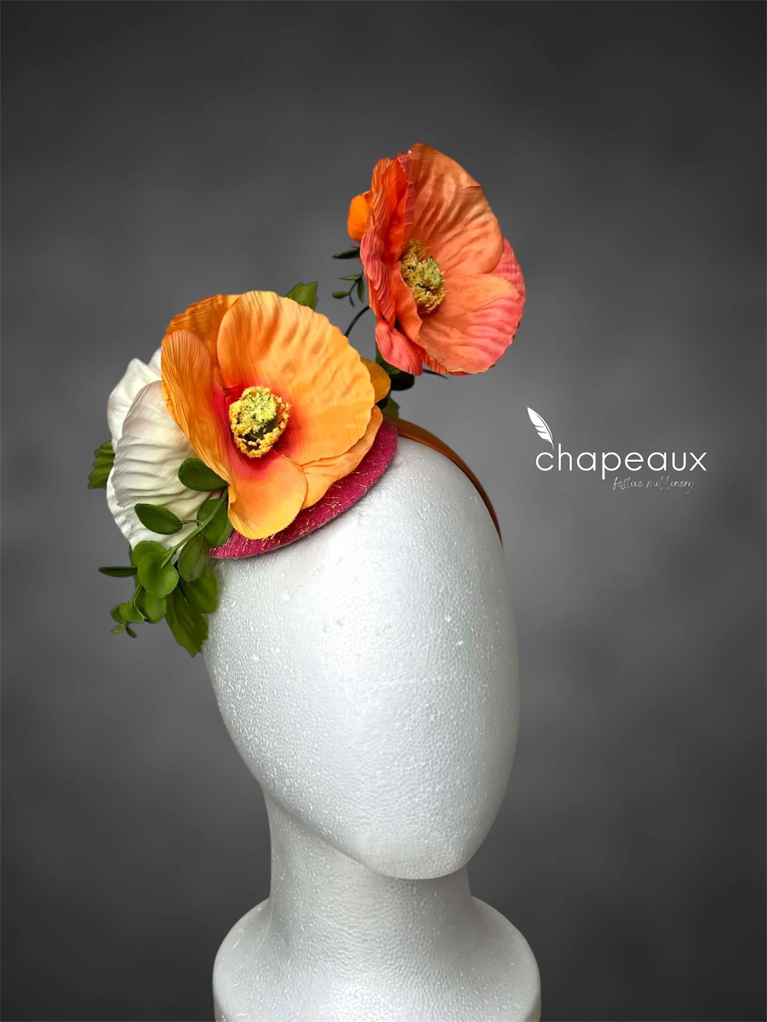 Full of whimsy and wonder! Featuring playful poppies in orange and white, seated on a pink base and accented with gold lace mesh. Attaches with a matching satin headband.