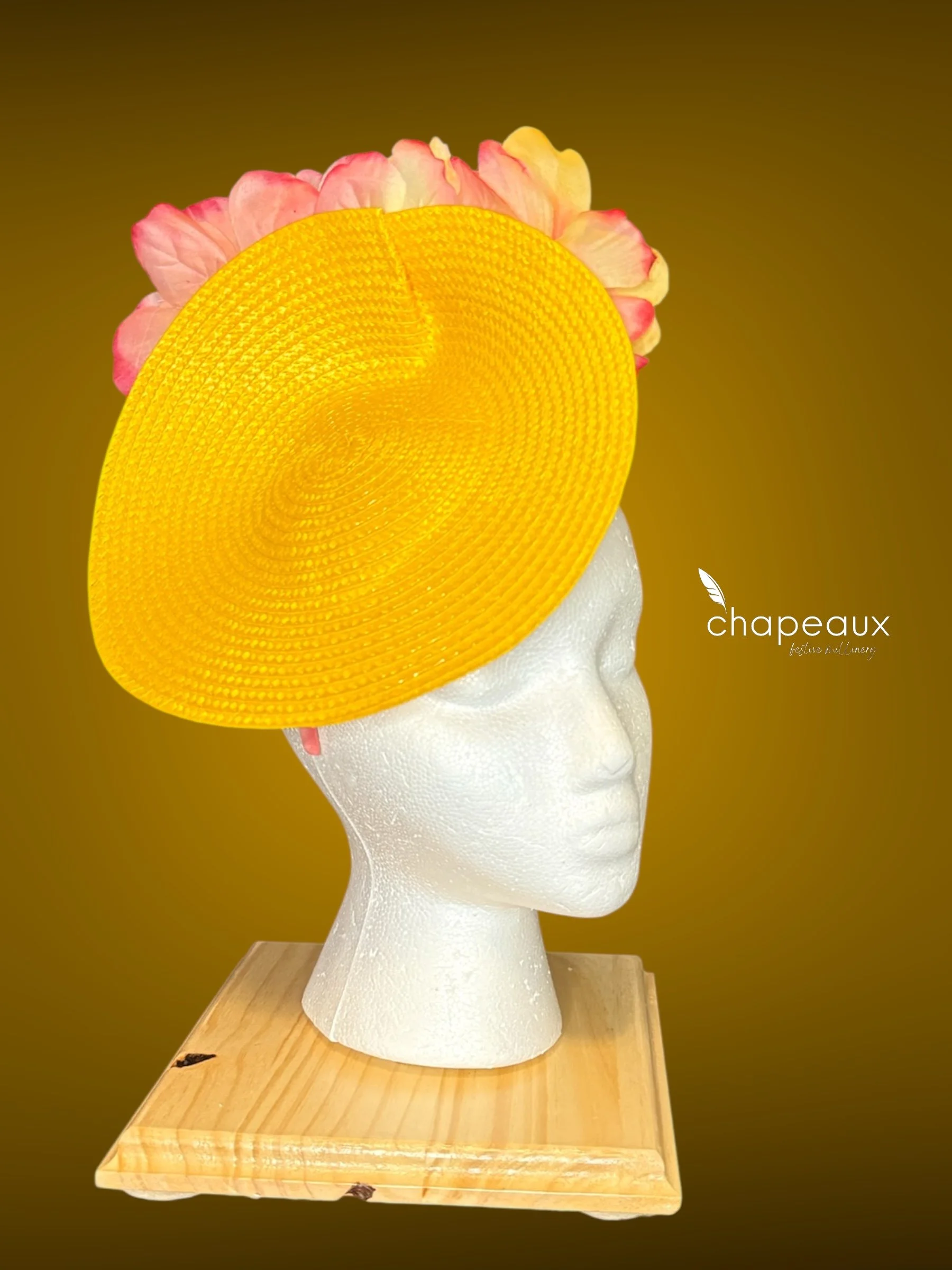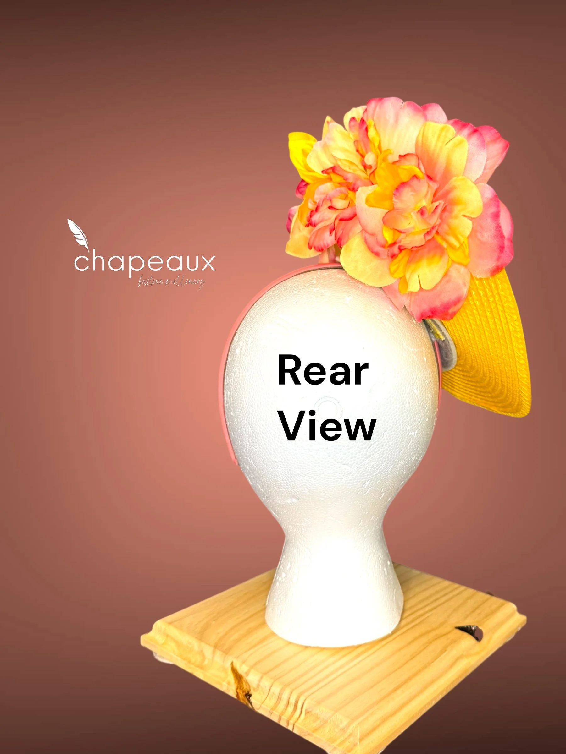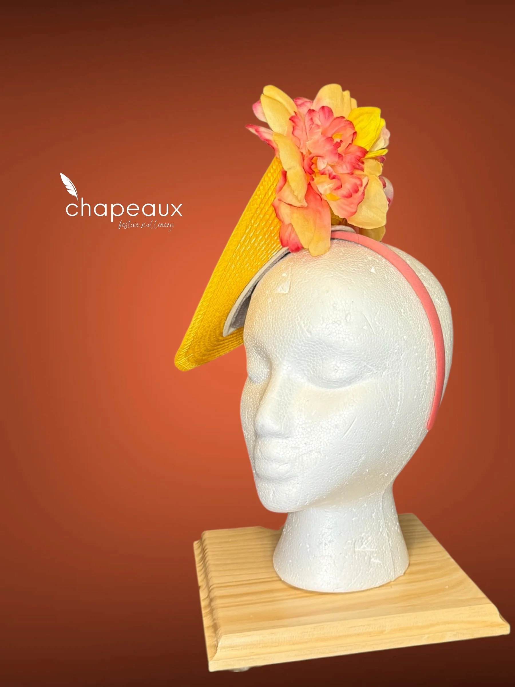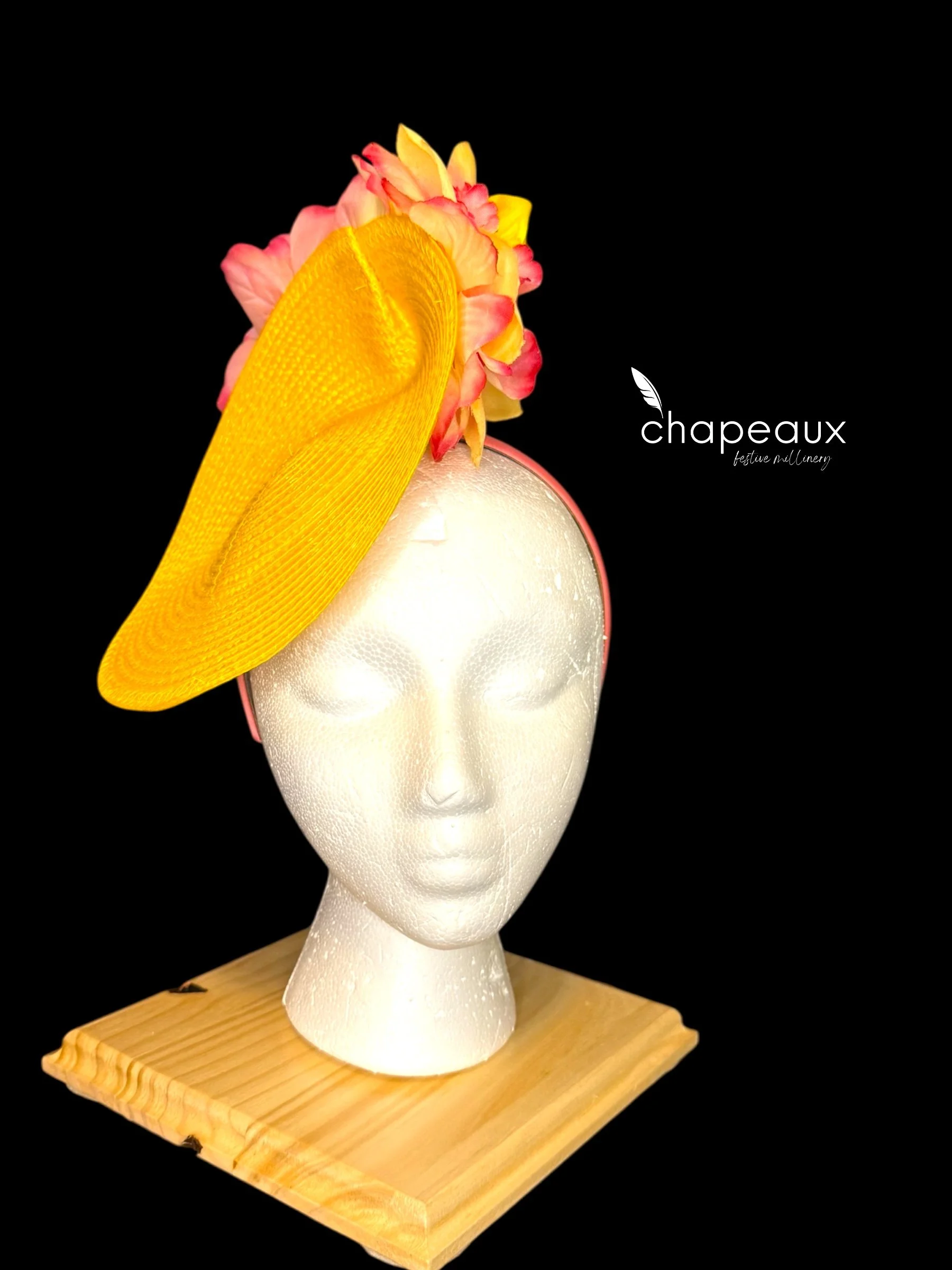 Delilah: Sunny Pink features a classic Chapeaux design. The sunny yellow base is sculpted by a Chapeaux designer and stitched into shape, with the upturned side sporting a horizontal cascade of custom flowers in shades of pink, coral, and yellow. Attaches with a contrasting coral satin headband.