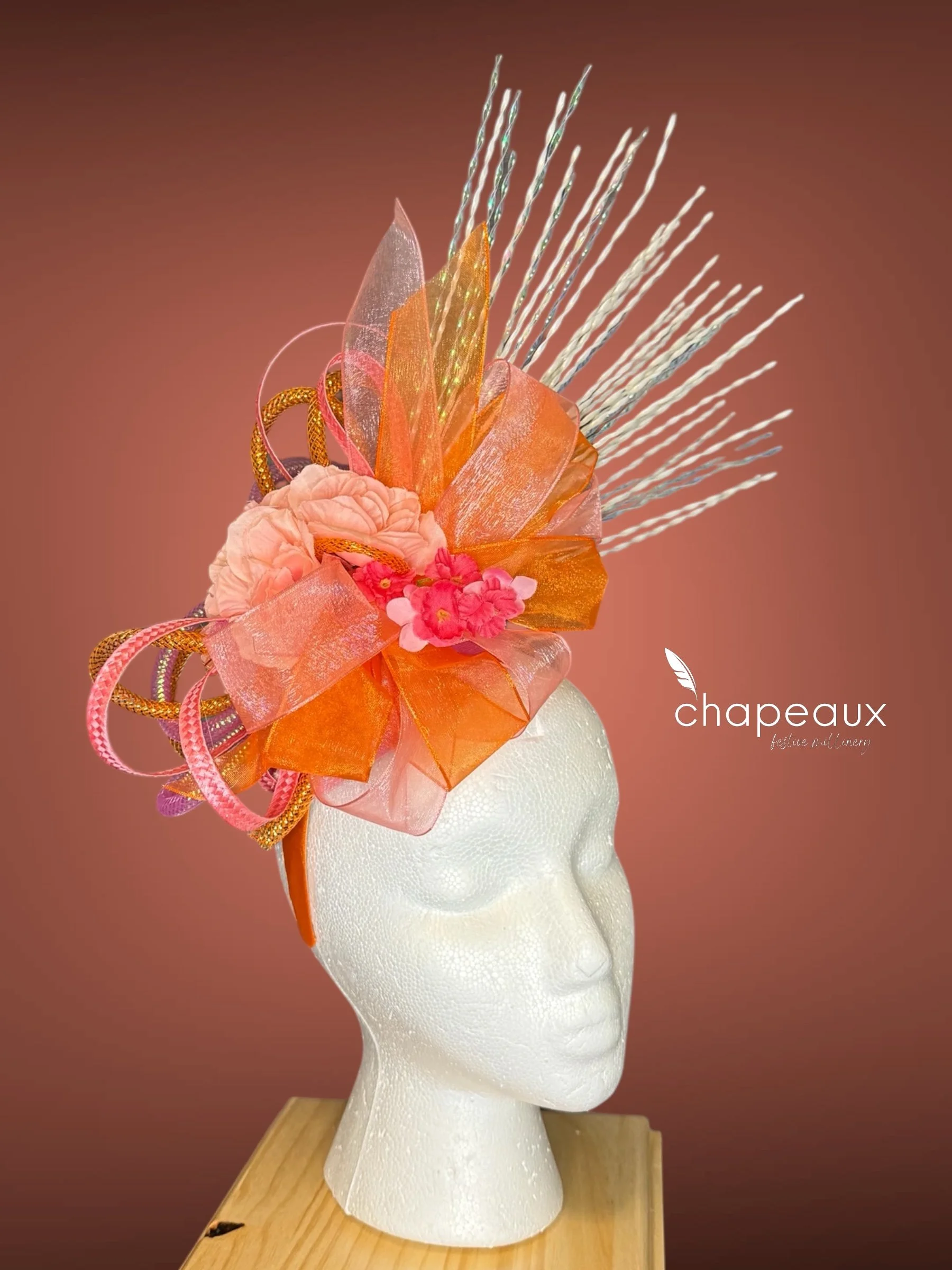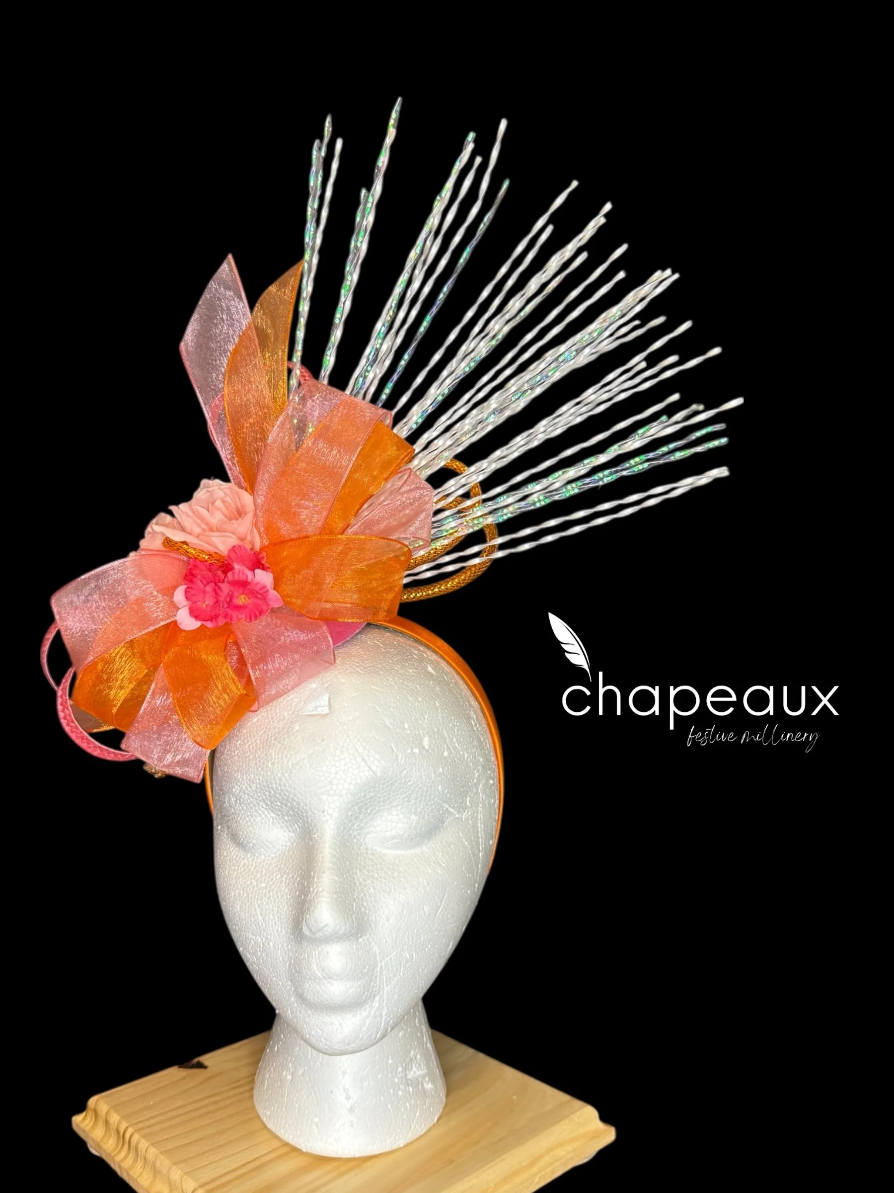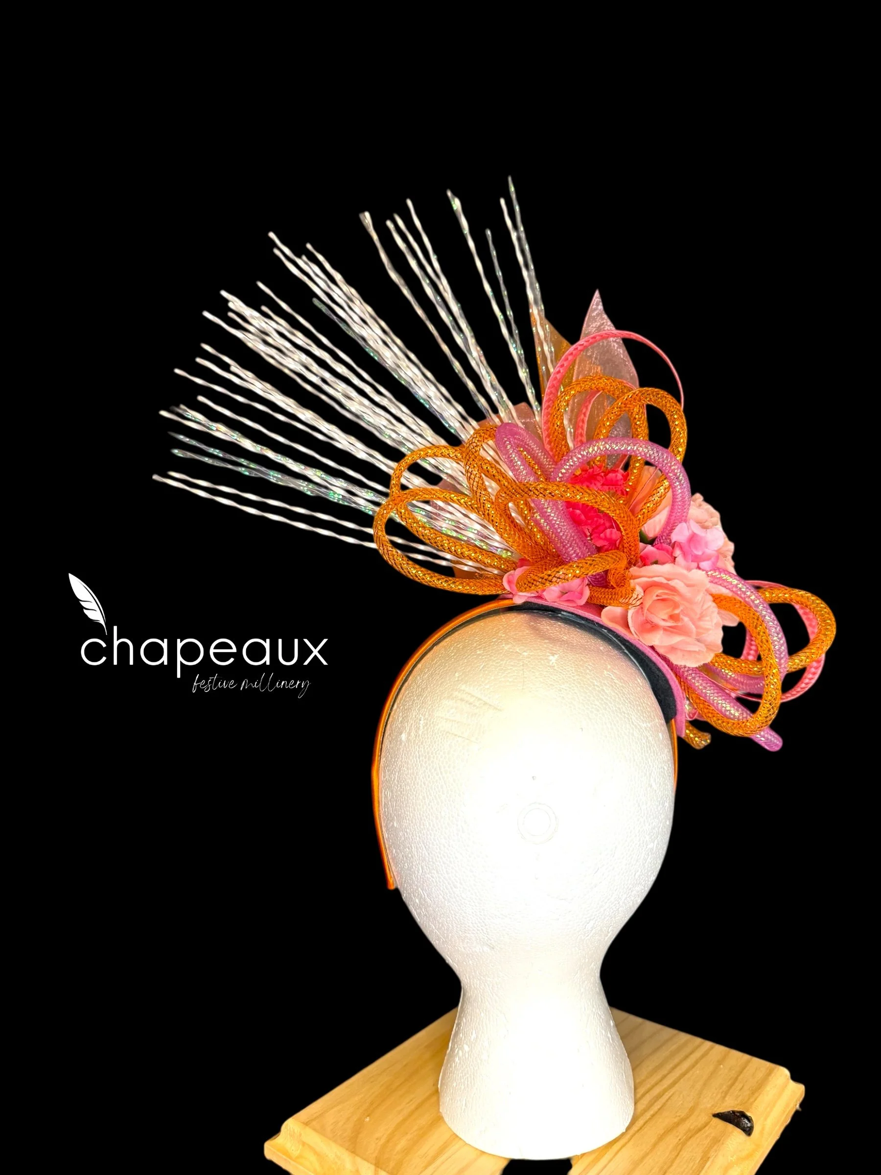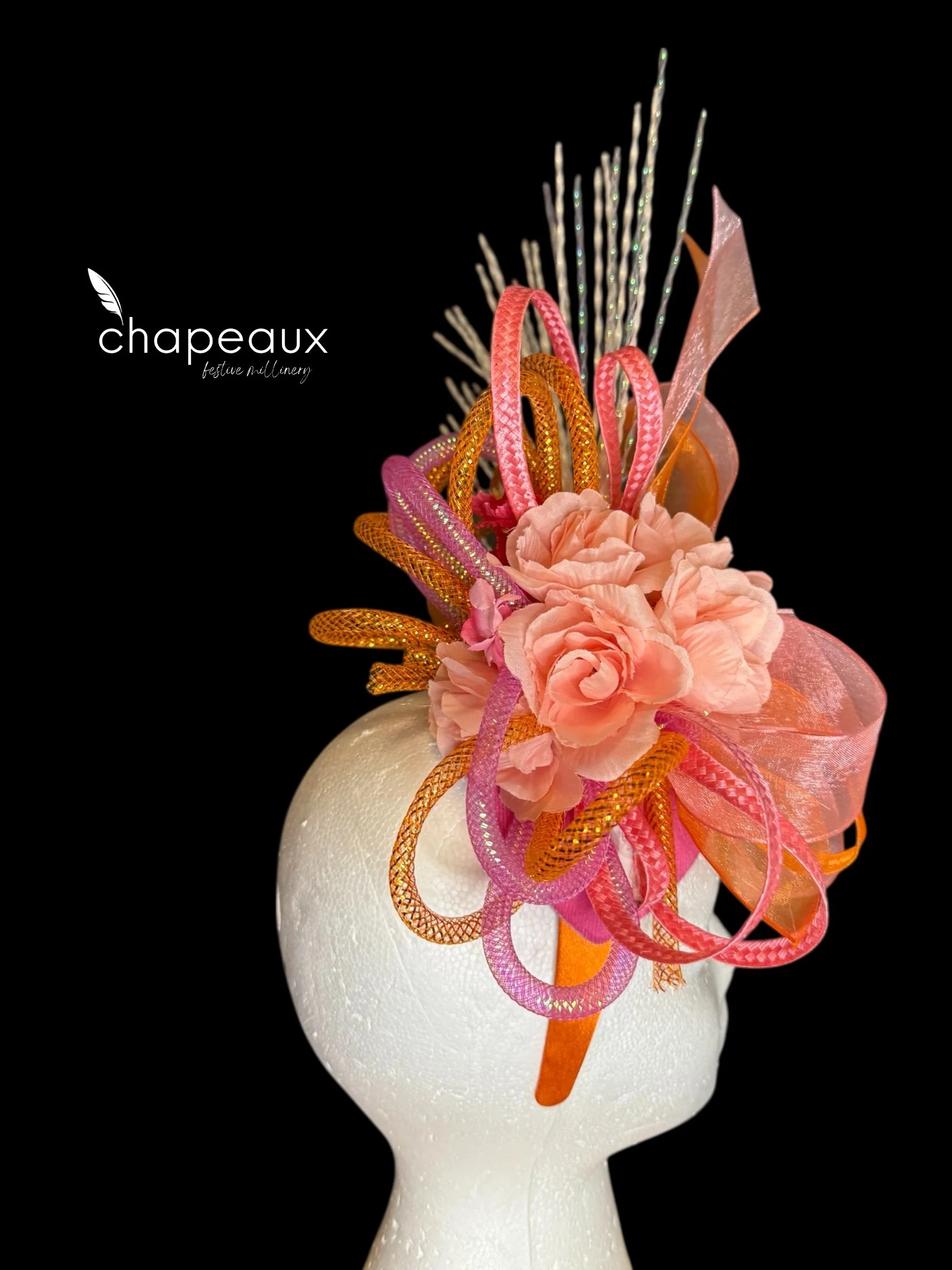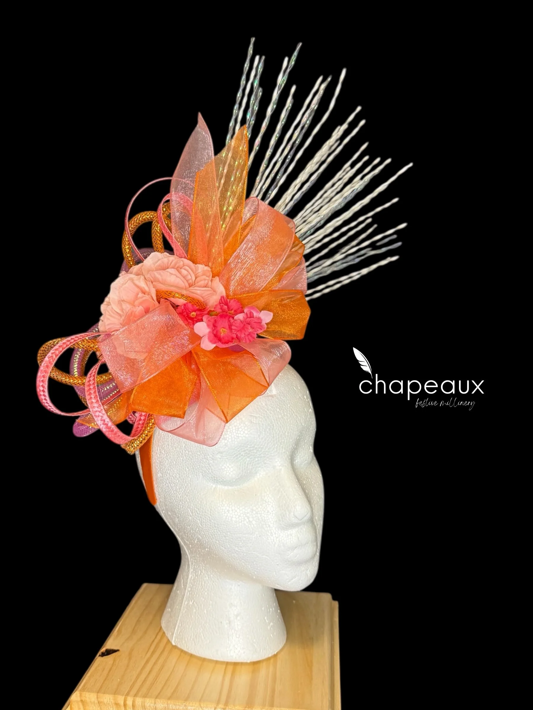 When flashy and fun are on tap, Festive Pink and Orange fits the bill! With a shimmery spray and a mini-cascade of roses, this Chapeaux is perfect for Derby, Oaks, a garden party, afternoon tea, or any other beautiful event. Attaches with a matching satin headband.