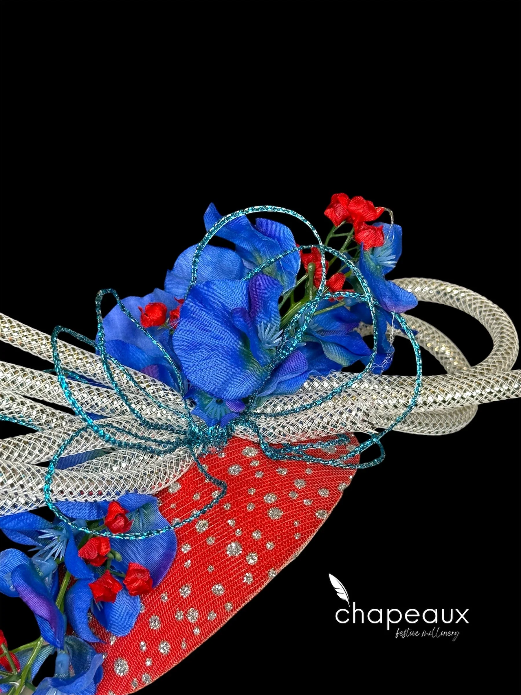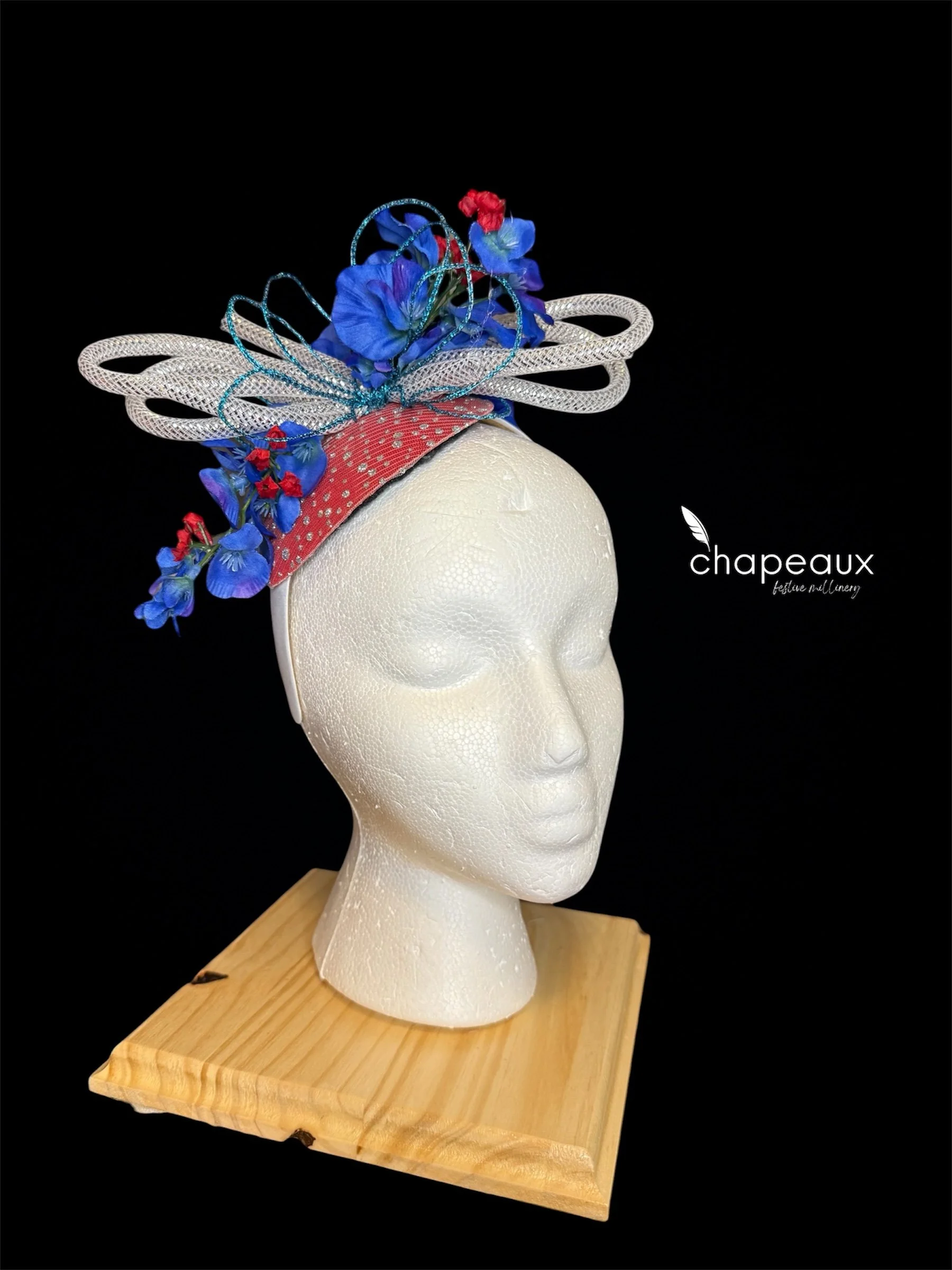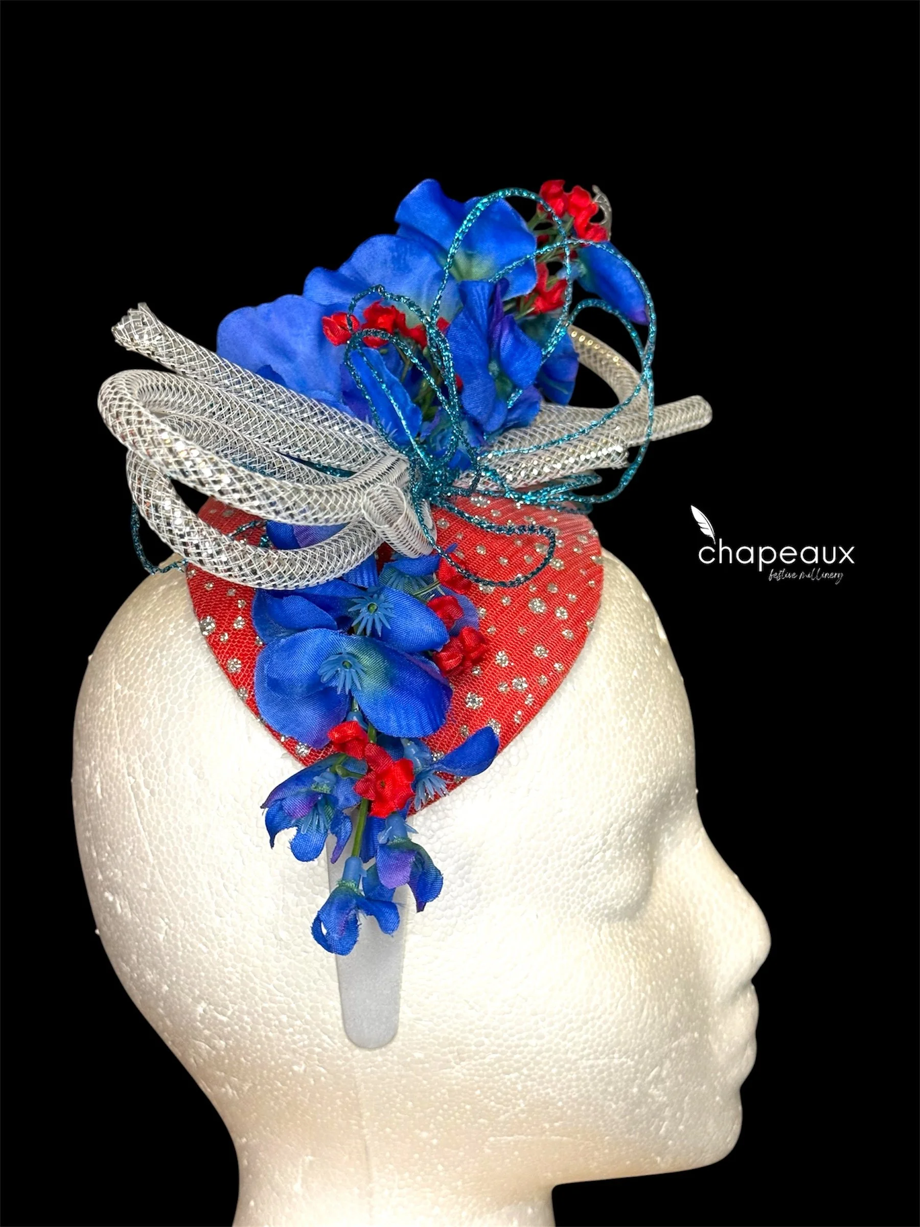 A little bit of shimmer, a gorgeous bit of blue, and a splash of red make this an adorable Chapeaux … perfect for Big Bash, a Derby party, a very British afternoon tea, July 4th, or any other beautiful event. Attaches with a silvery satin headband.
