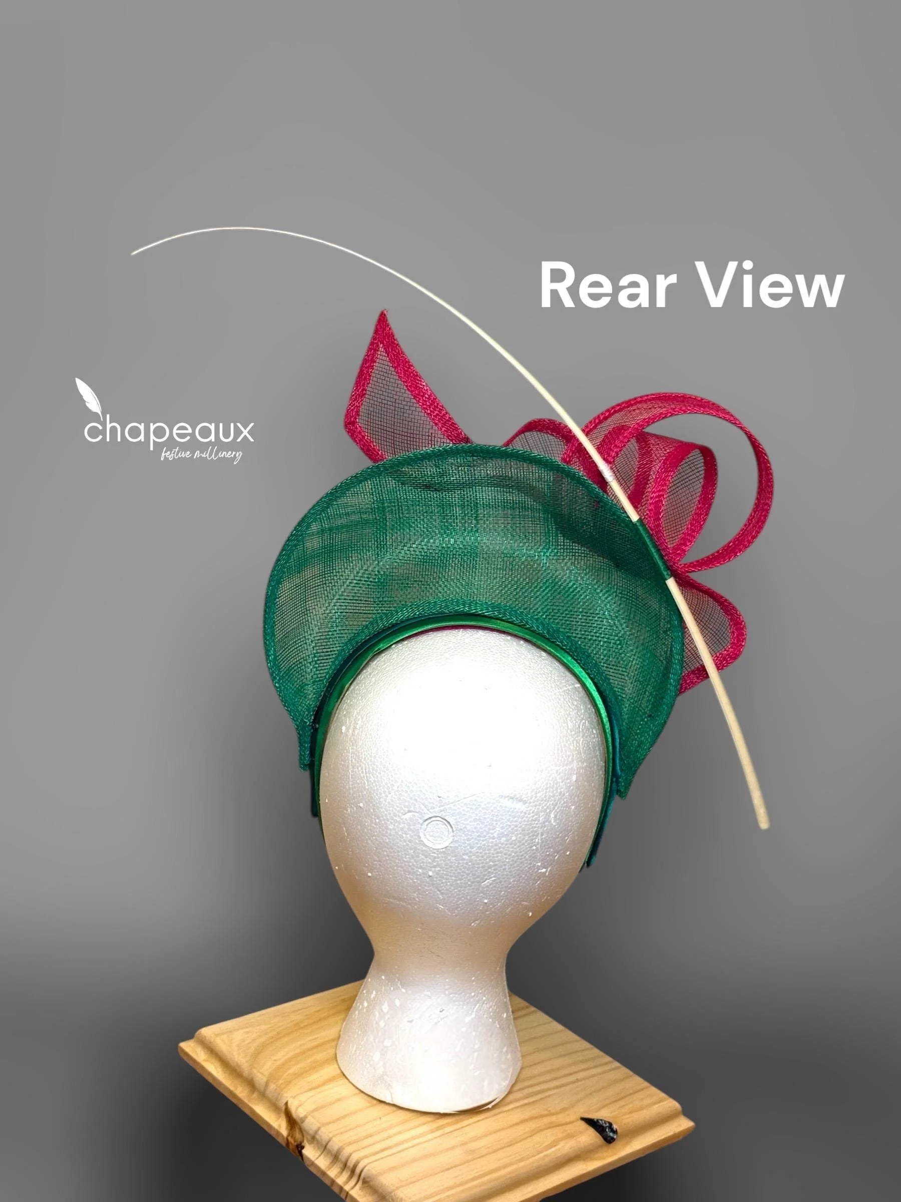 Halo Edit #1 is a bold combination of pink and green and white! A sculpted pink bow atop a green halo base, both in sinamay, accented by a white quill. Attaches with a matching green headband.