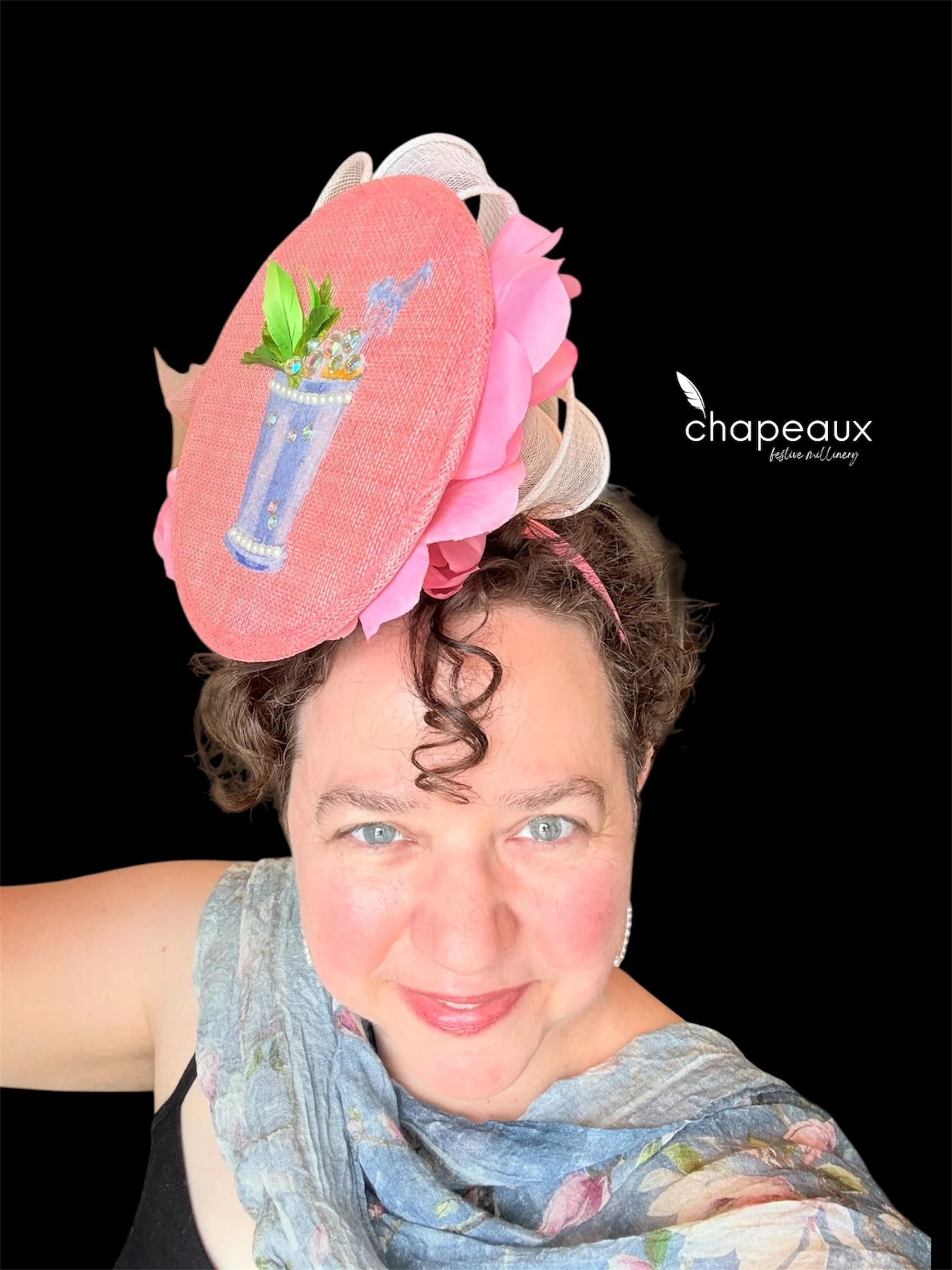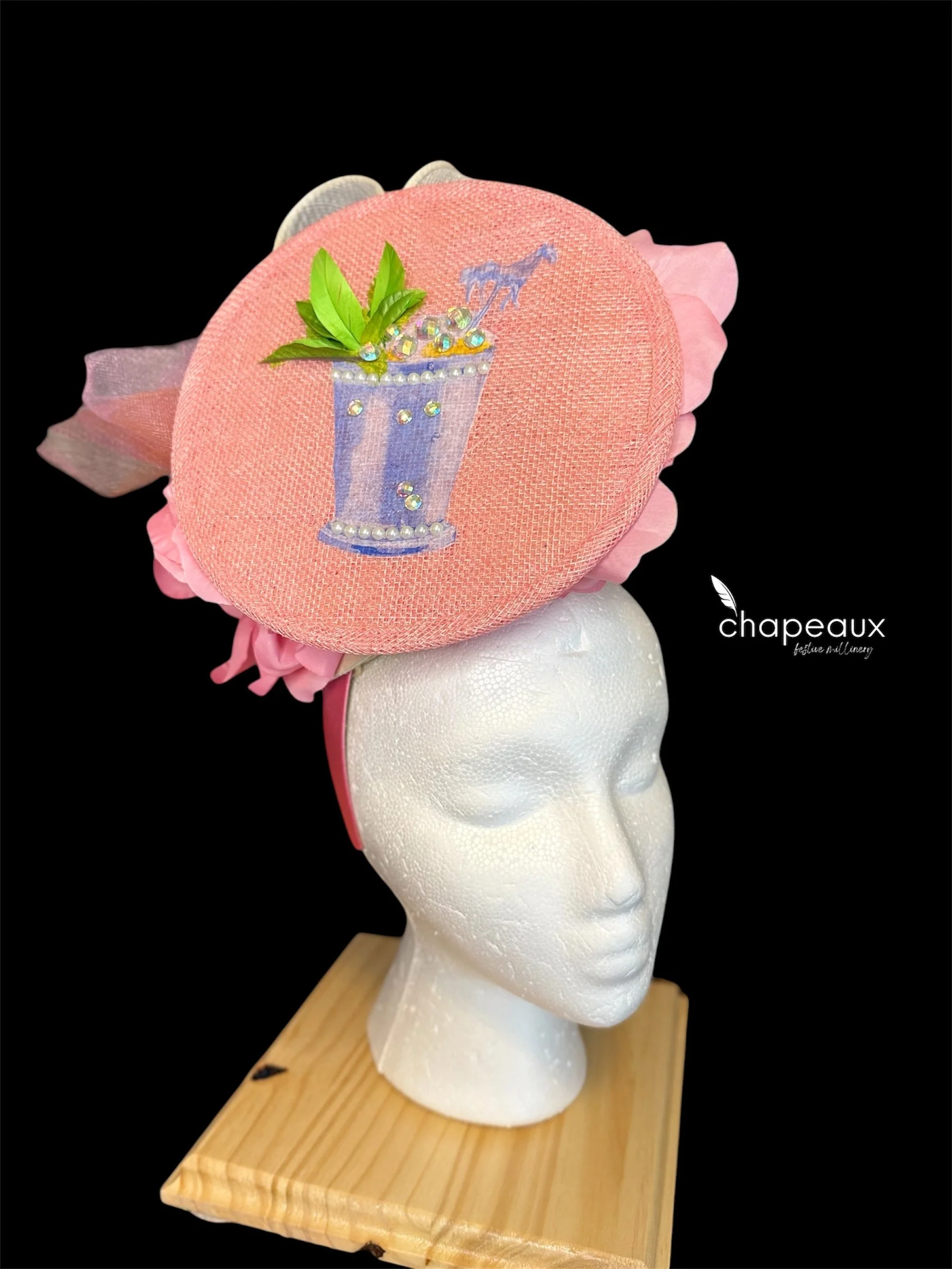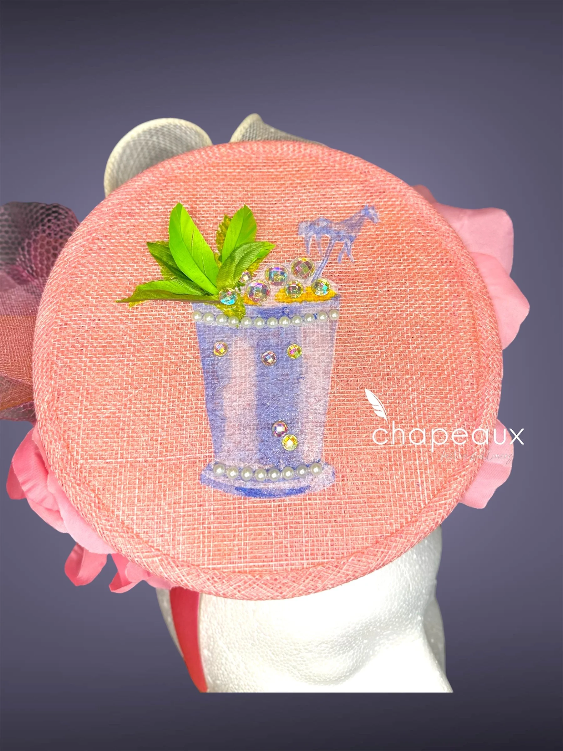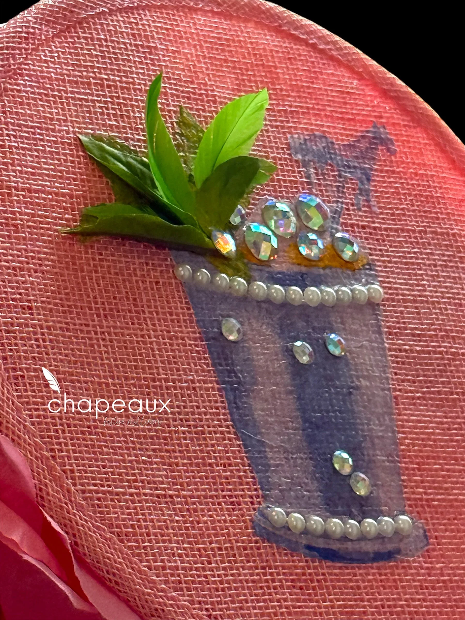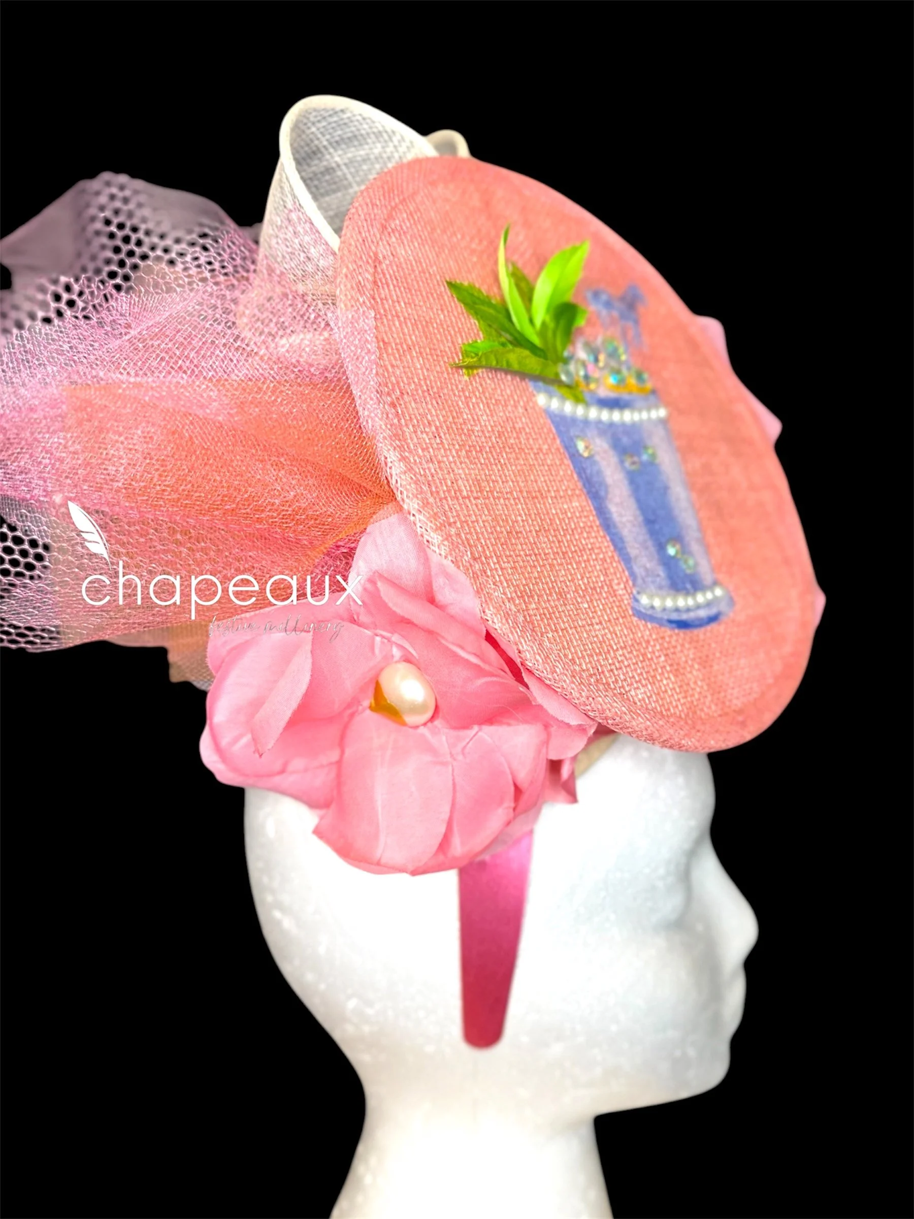 Jumping Julep is the classic Derby cocktail-turned-fascinator! This Chapeaux features a mint julep accented by 3D pearl bead trim, sparkly “ice,” and feather and faux “mint leaves.” This floating Mint Julep cup is complemented by a pearly white bow sculpted in sinamay, a tulle pouf, and custom flowers with handpainted pearl bead centers.