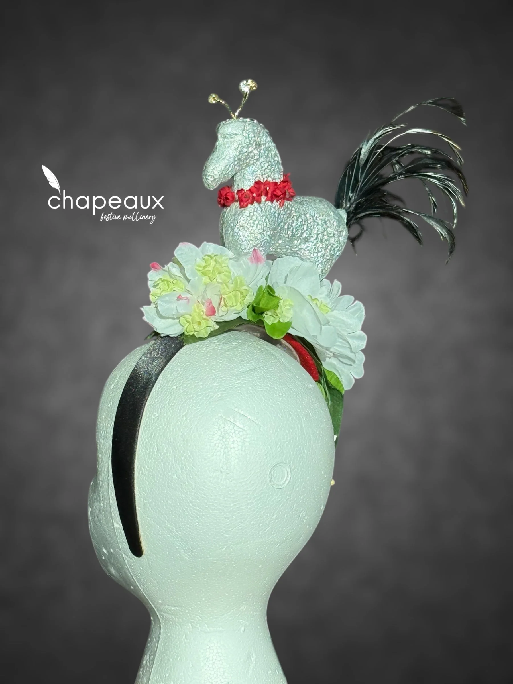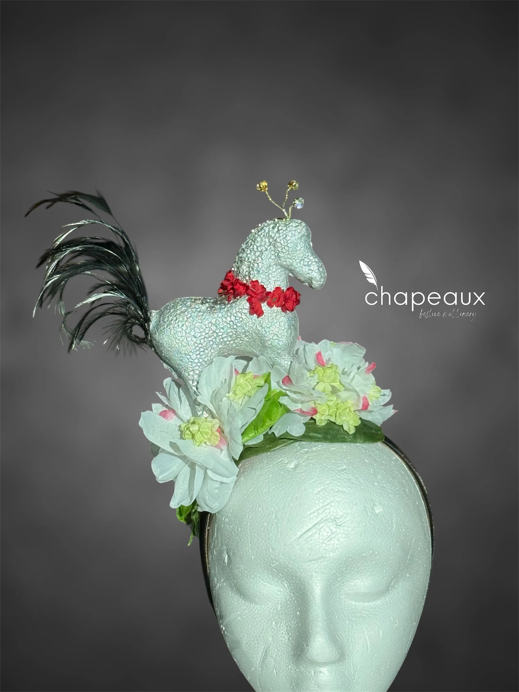Silver Derby stands for fun! Frolicking in a field of white flowers, this hand painted silver horse with a rhinestone headpiece, a necklace of miniature red roses, and a tail of silver-accented feathers will steal the show at any Derby party! Attaches with a black satin headband.