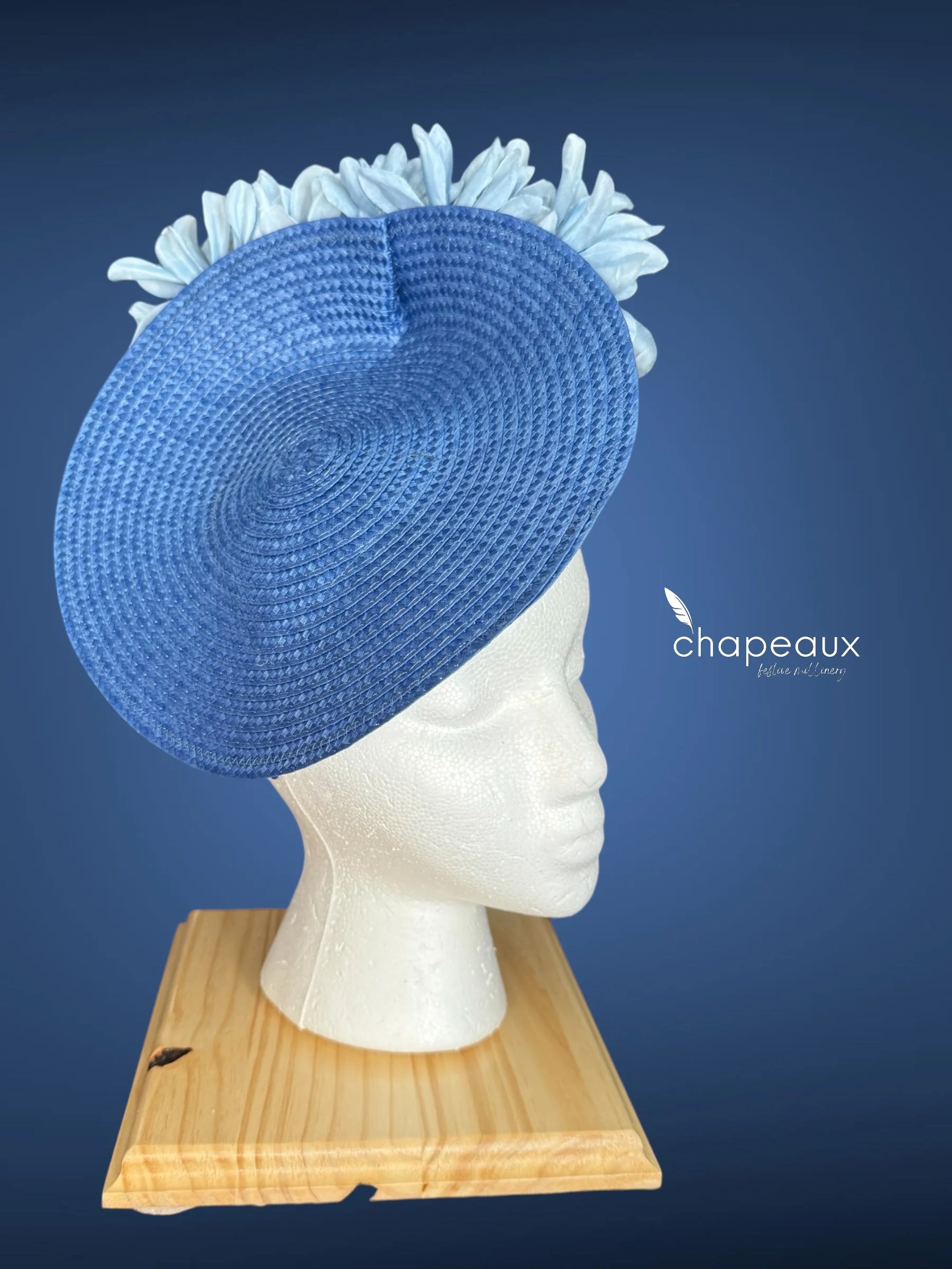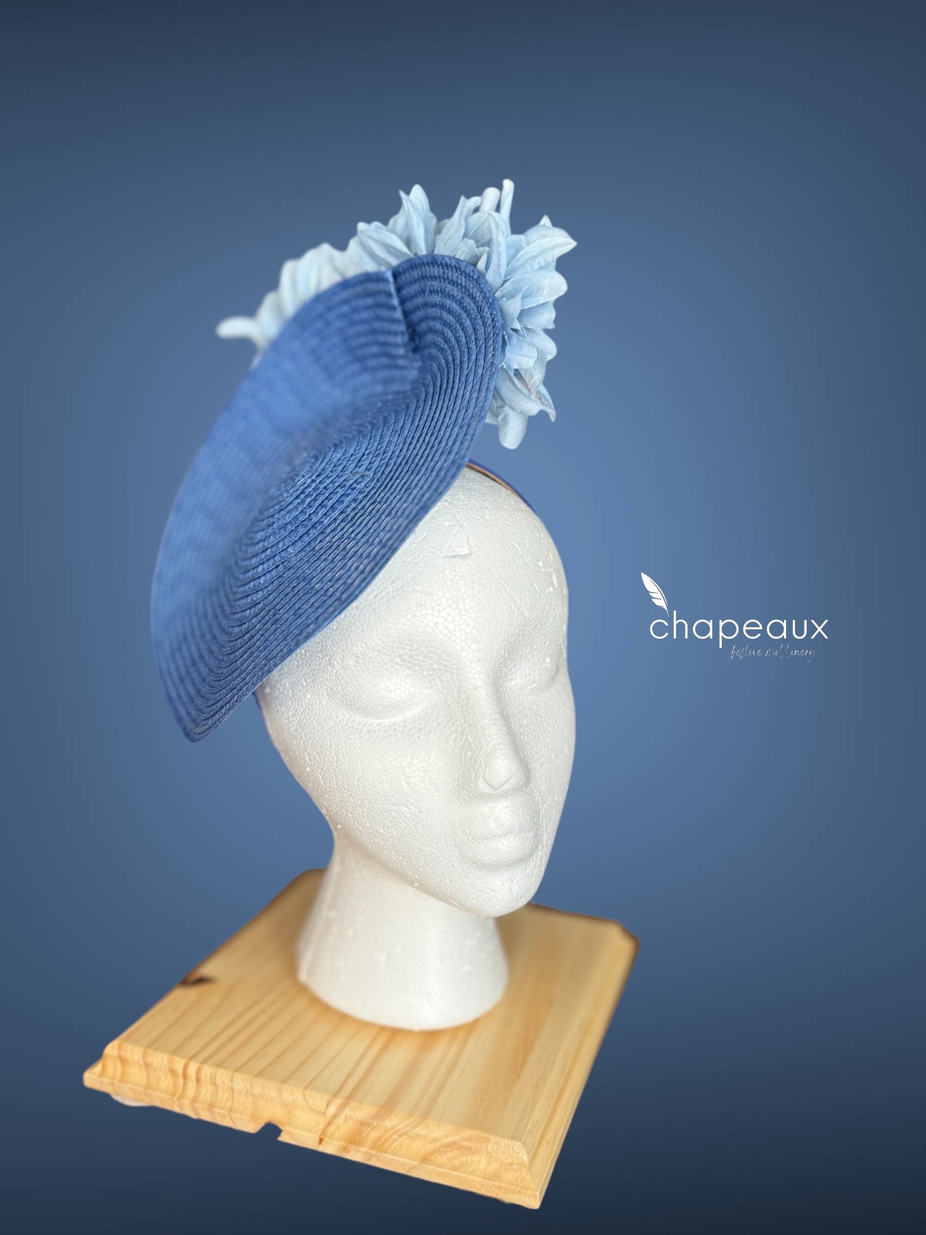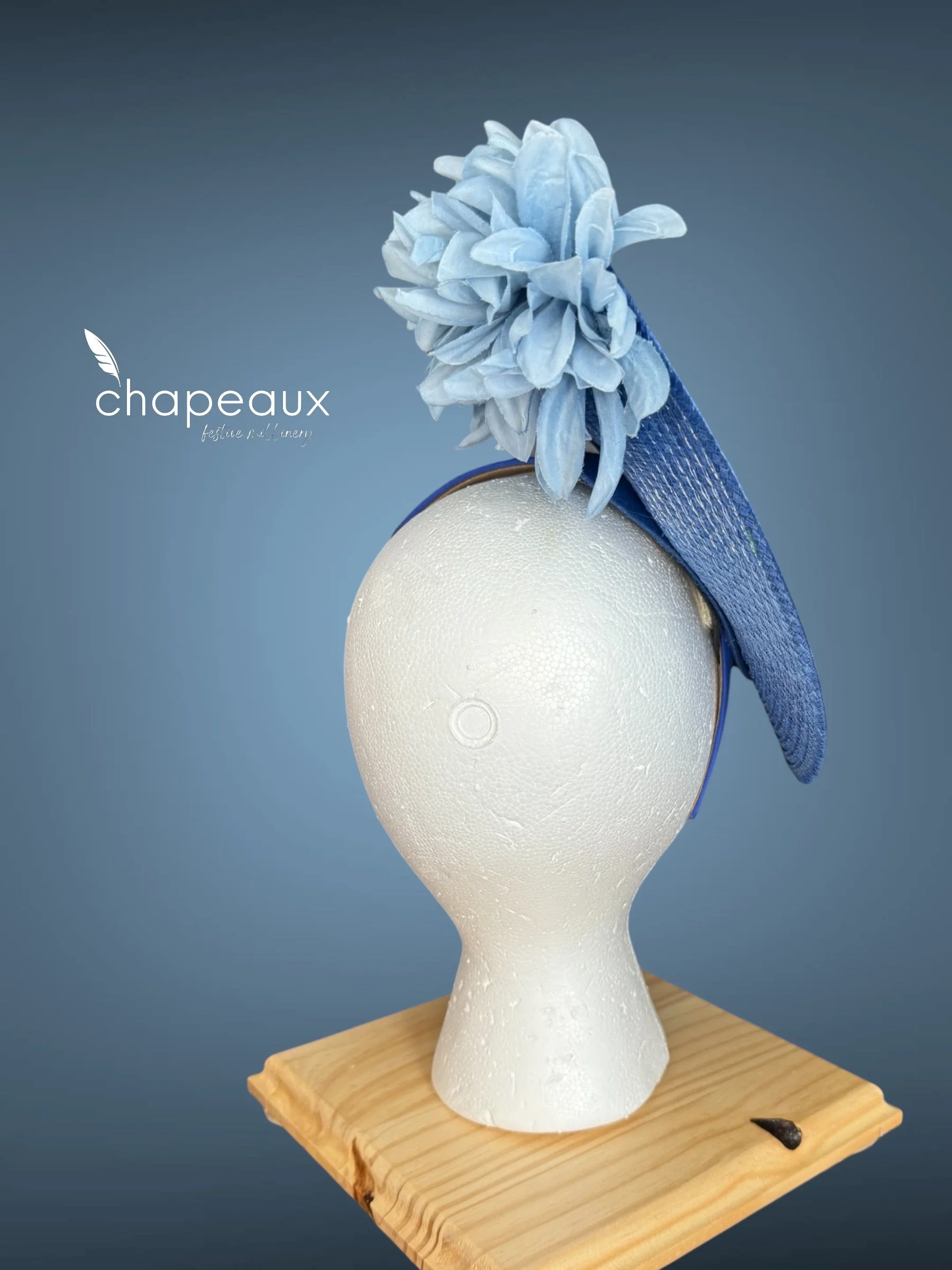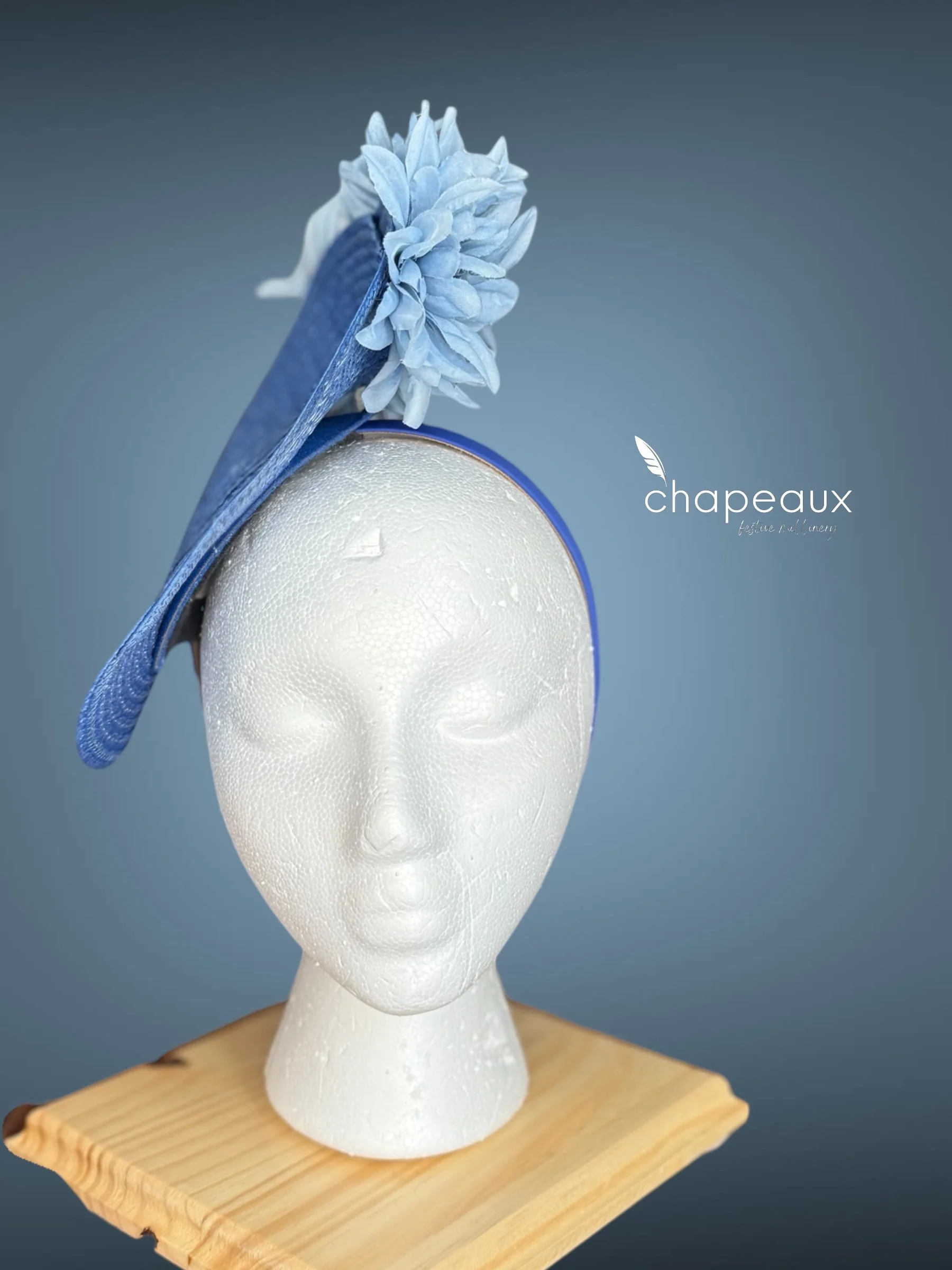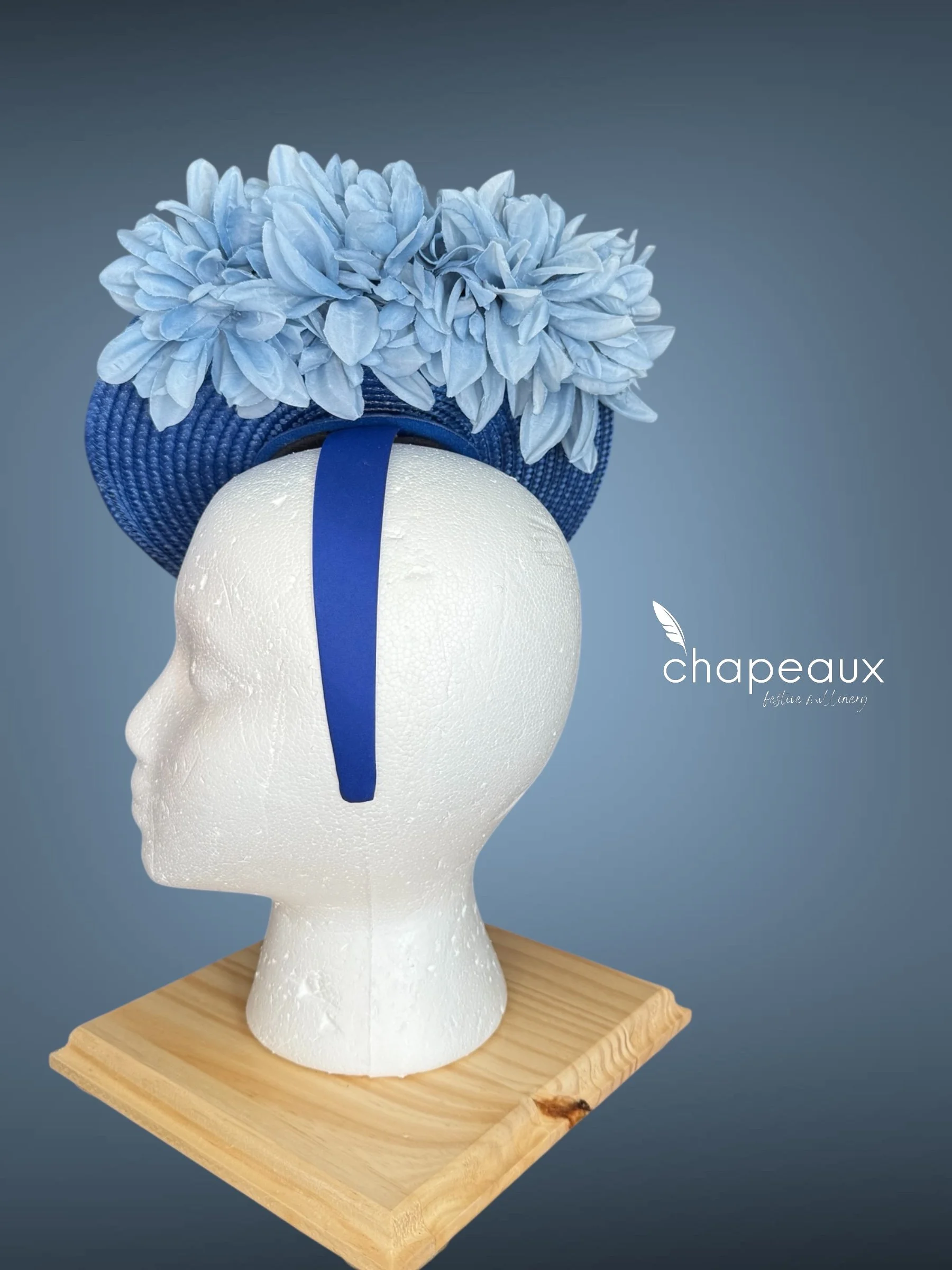 Delilah: Monochrome Blue features a classic Chapeaux design. The base is sculpted by a Chapeaux designer and stitched into shape, with the upturned side sporting a horizontal cascade of custom blue flowers. Attaches with a matching blue satin headband.