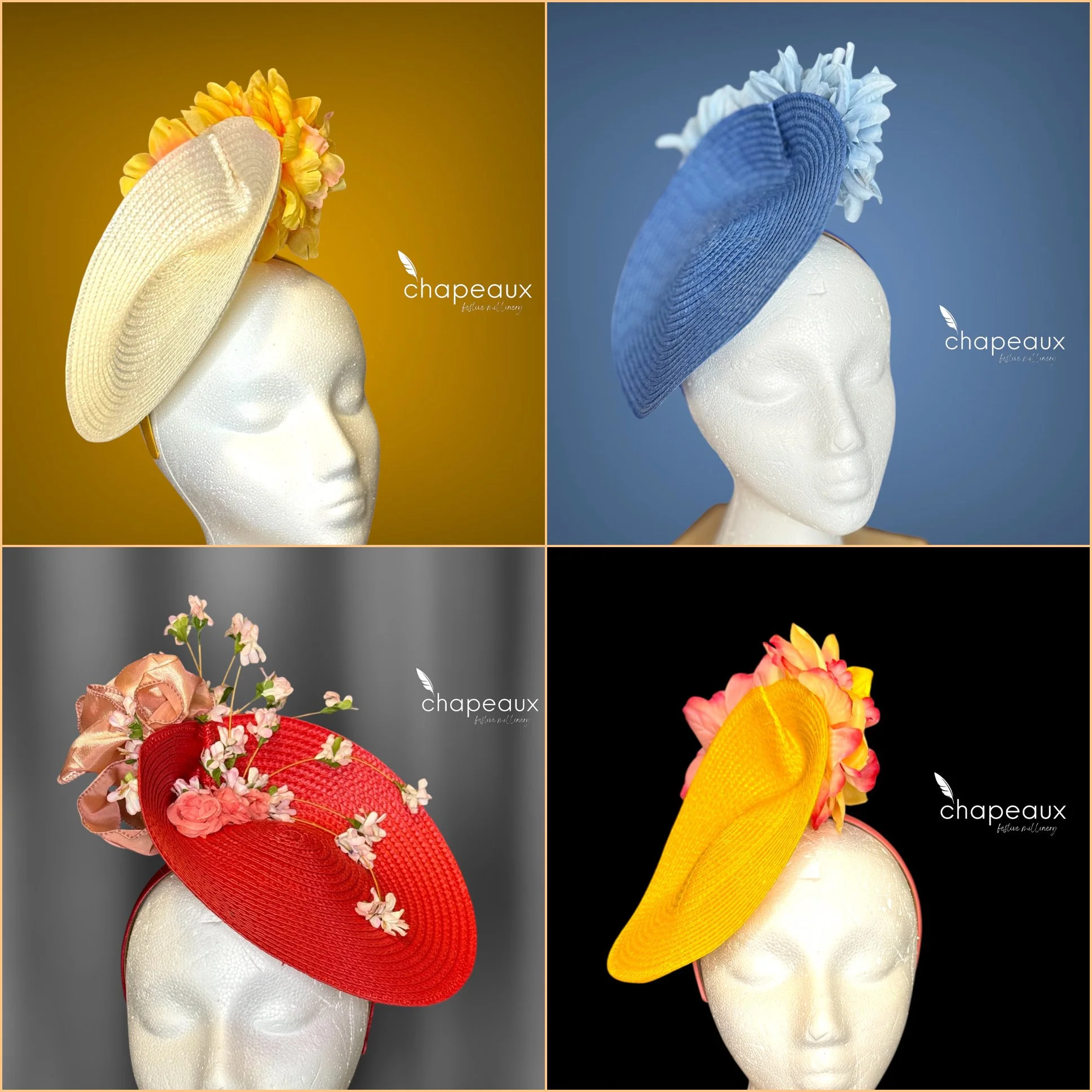 Scroll through the pictures to see other Delilah colors, including one upgraded option with additional embellishments. Please contact Chapeaux for pricing on additional embellishments.