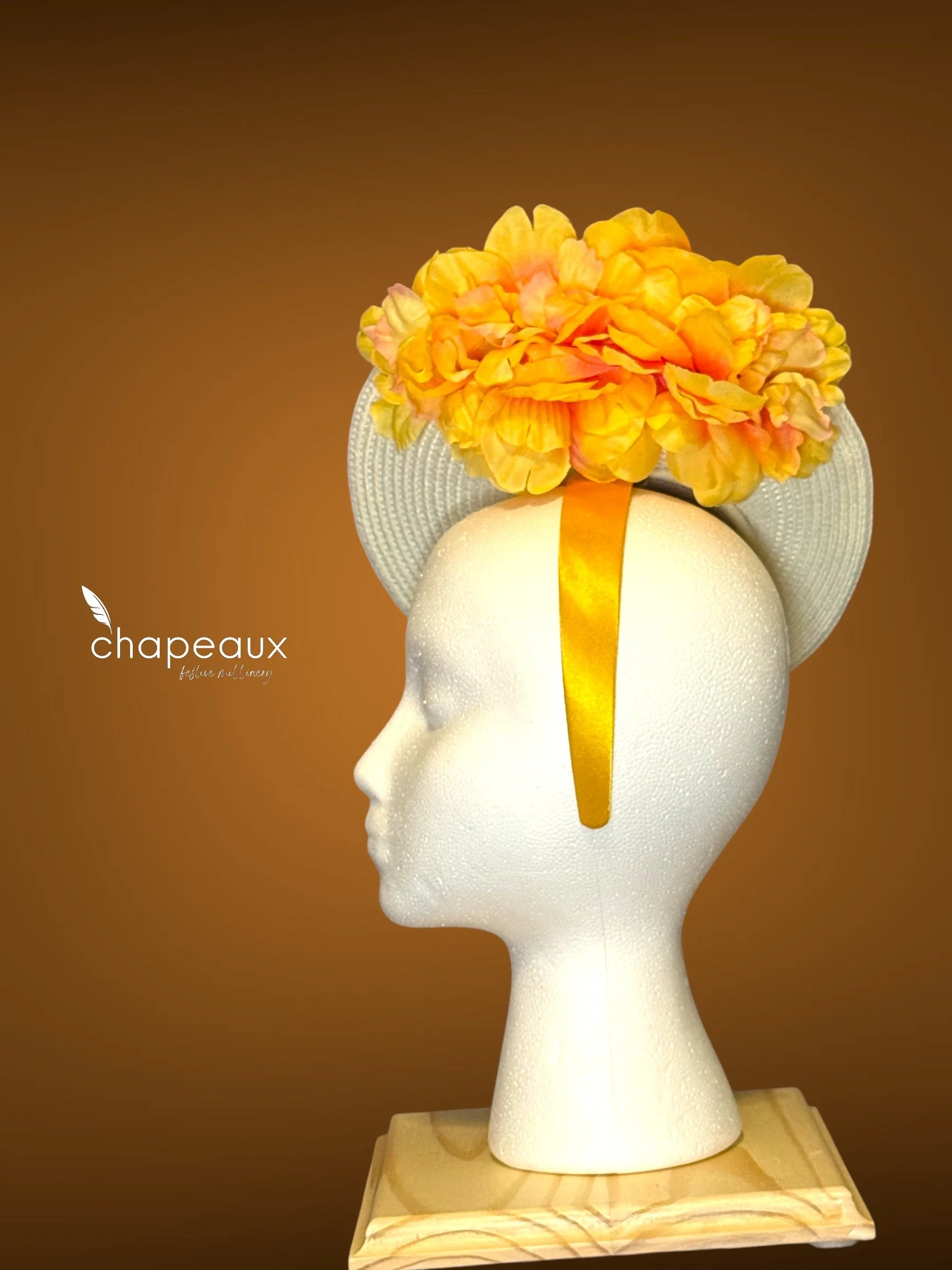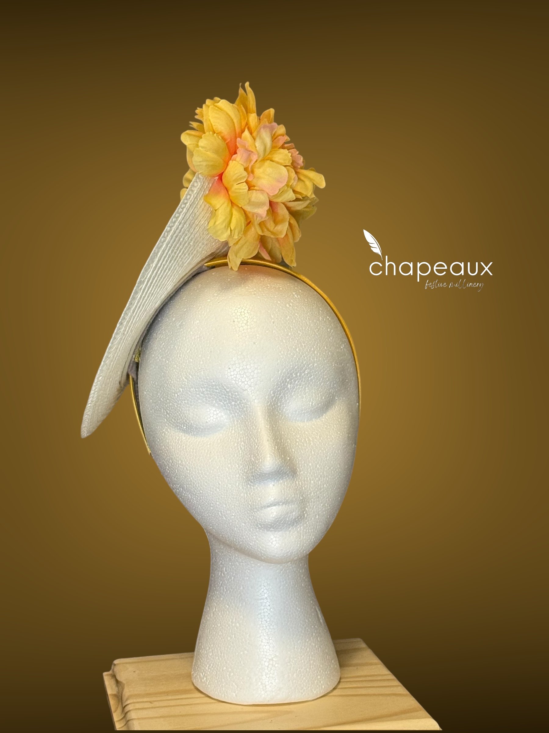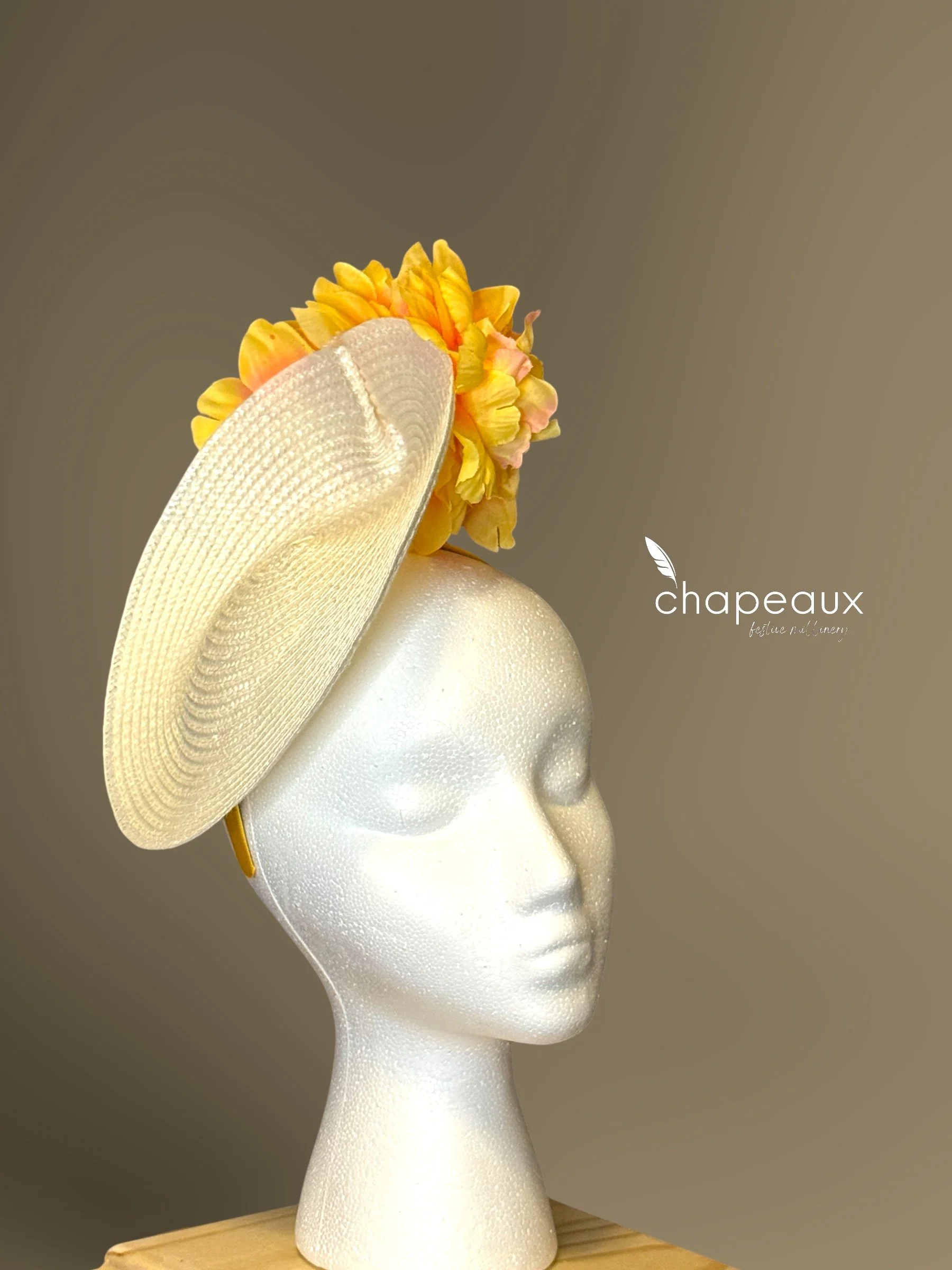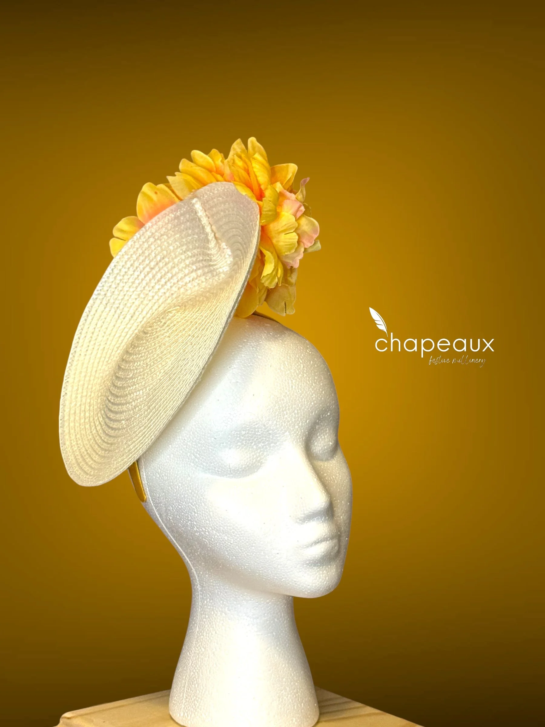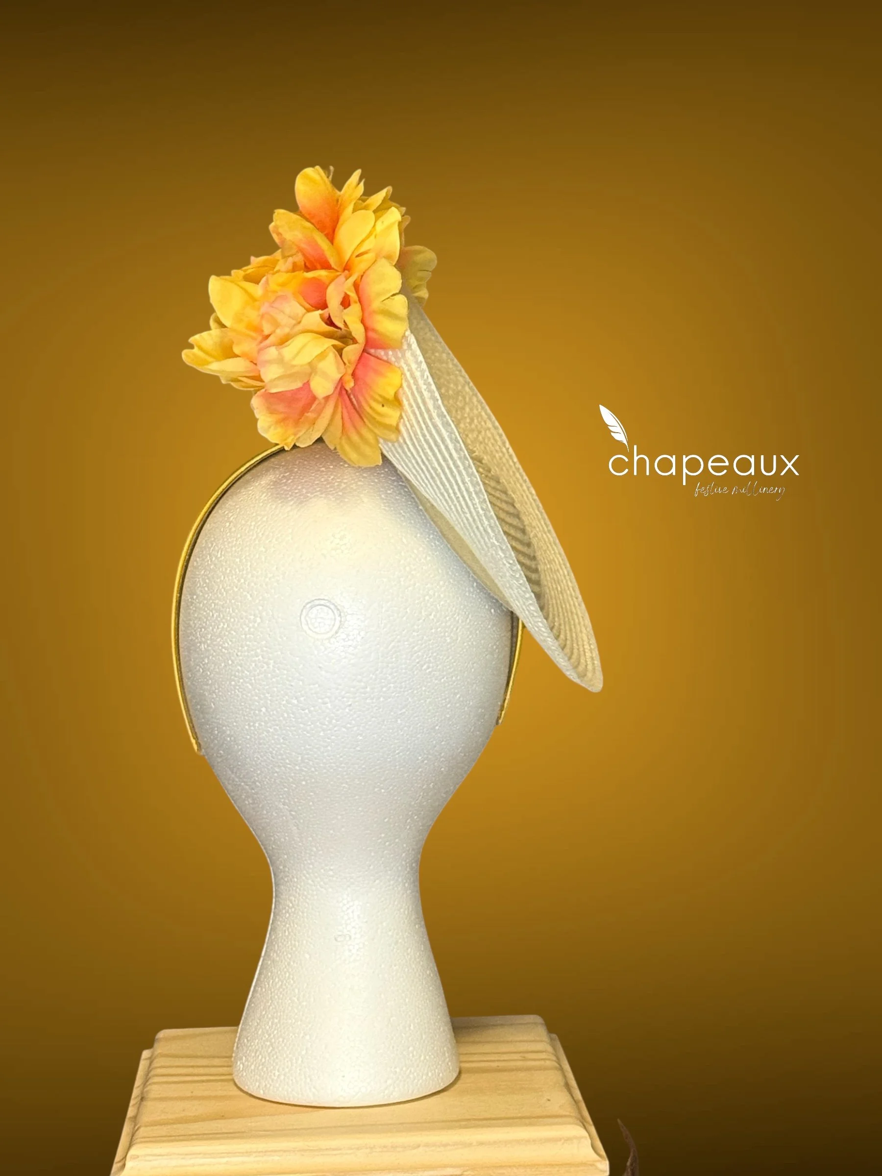 Delilah: Peaches and Cream features a classic Chapeaux design. The creamy base is sculpted by a Chapeaux designer and stitched into shape, with the upturned side sporting a horizontal cascade of custom golden peach flowers. Attaches with a matching golden peach satin headband.